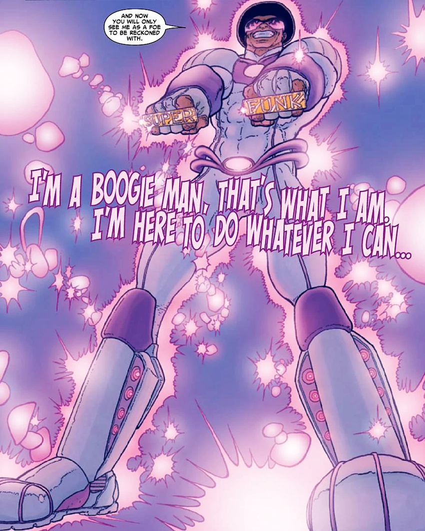 Powers/Abilities: Hypnosis via specialized guitar; Boots grant: Knockout gas projection, Retractable knives in the soles