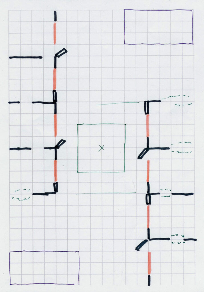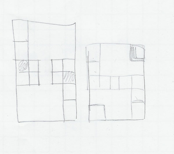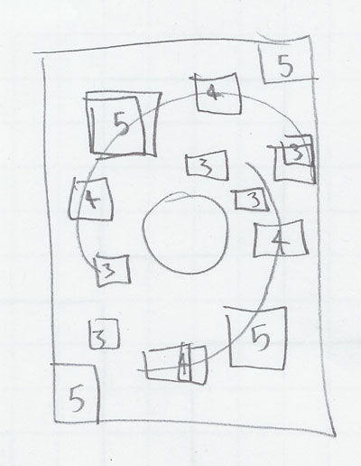 For the next design, I threw out the dividing line of cells and just ran cells down both edges of the map, roughing in a guard station in the center of the map to prevent straight-line shots from one starting area to the other. Four large cells line each side, with big windows (the orange lines) on the front of each one; after randomly using the orange marker to indicate the windows, I remember some brainstorming about making the windows a special type of wall that allowed line of fire but not ranged attacks, but that was quickly thrown out as needlessly complex.