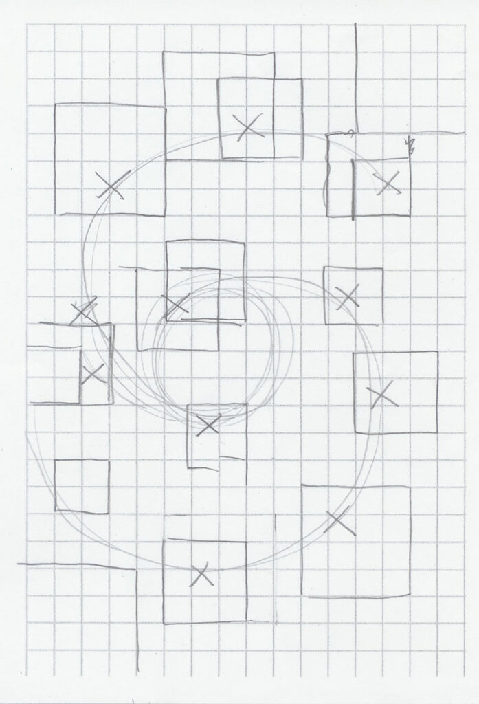 This new layout played with the idea of spirals, specifically two spirals of cells interlocking yin-yang-like and guiding forces from their corner starting areas inevitably toward a central conflict area, while allowing many potentially twisting paths for characters to take through and across the area. The numbers are me speculating on how big cells might have to be at certain points (3 by 3, 4 by 4, 5 by 5) to sit along the spiral. But there was only one way to find out if they would actually fit and do the job, and that was to take it to the grid.