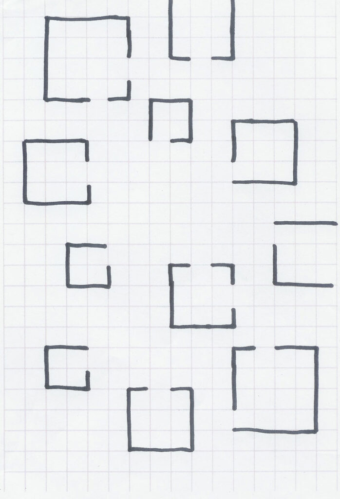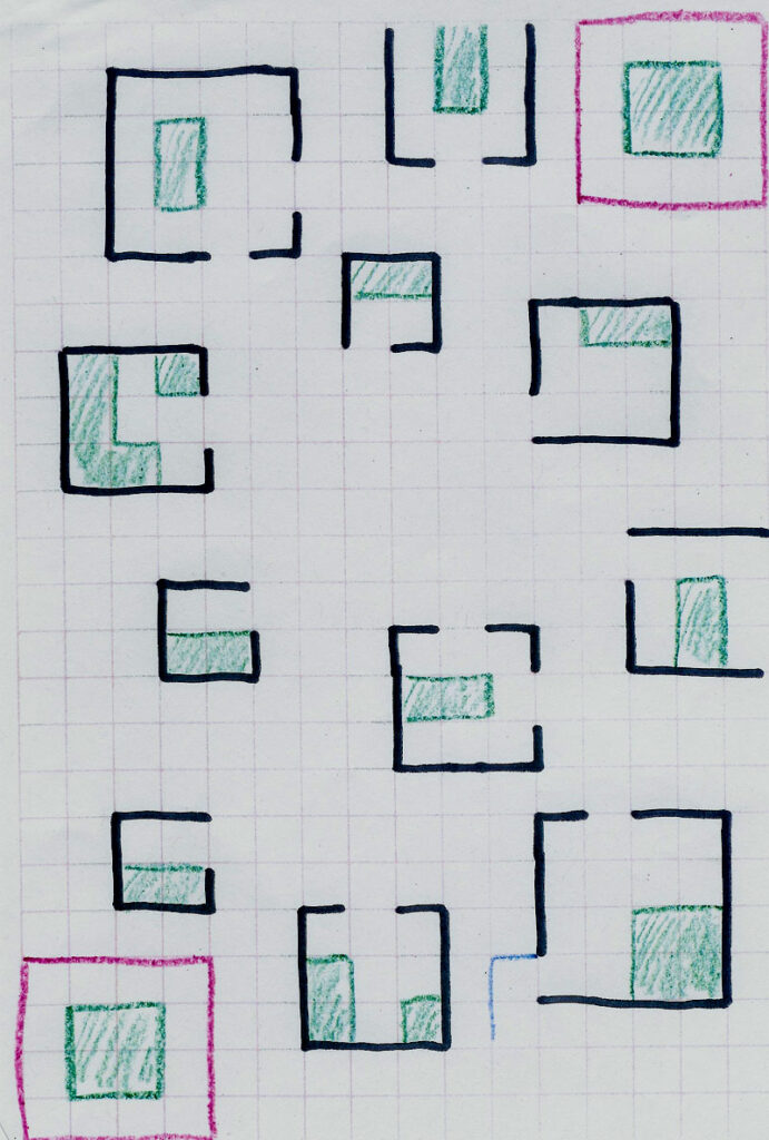 Here are a couple idle sketches I made during that meeting. My goal when designing a map is often to create a balanced environment that doesn’t give one force and their choice of starting area an advantage over another. That’s what I was attempting here, with the added tweak of corner starting areas at the top right and bottom left corners. I played with the idea of an S-shaped line of cells dividing the map up into two ‘arenas’, one by each starting area. In the right sketch, I added a gap between the two areas that created a chokepoint for the conflict. But that resulted in ‘dead’ areas on the map (the shaded-in cells), so I threw that idea out.
