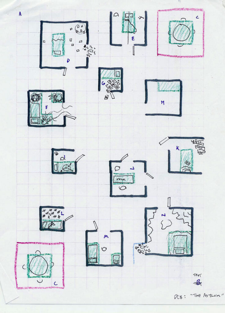 But eventually I arrived at a layout I liked. Then it was time to make sure I could still map the metaphor of the map to the mechanics I wanted. To justify the open areas the forces would be starting in, I made them public areas, with tables and chairs for the inmates. Then I started assigning cells to inmates, putting Dr. Arkham’s office (naturally) at the heart of the madness.