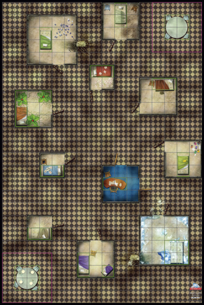 C: The two starting areas, each surrounded by a purple line. In the center of each, a round table surrounded by four chairs—standard prison-issue stainless steel or plastic, maybe—surrounded by the green line of hindering terrain. Every crazy villains gotta eat, and here’s where they do it.